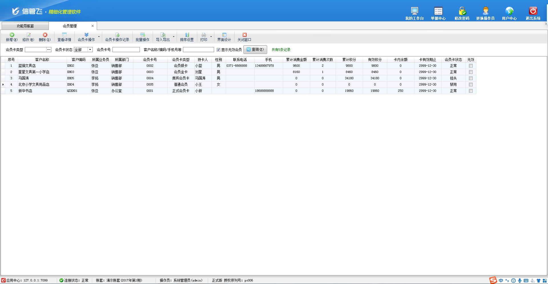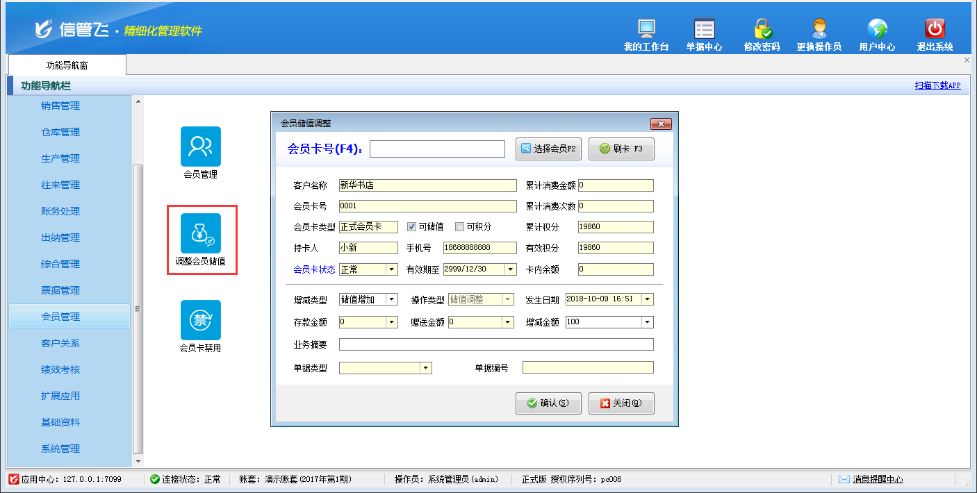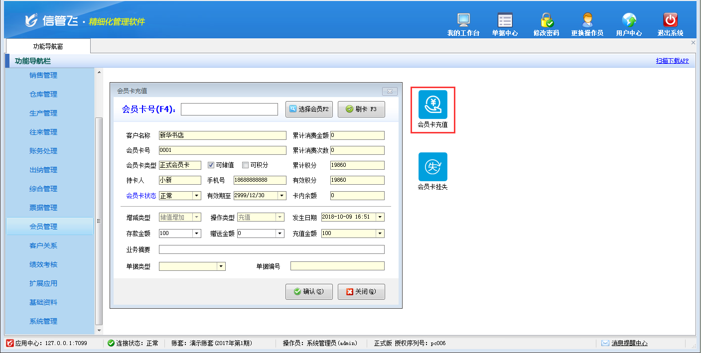 包括功能:會員卡類型維護、會員積分管理、會員儲值管理、調整會員儲值、調整會員積分、會員卡充值、積分兌換、會員卡補退換、會員卡掛失、會員卡禁用、會員讀卡器配置等。