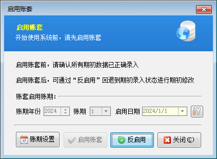 啟用賬期:是指準(zhǔn)備從哪個(gè)月份開(kāi)始使用軟件(舉例:假設(shè)當(dāng)前月份為2025年4月份,但我們想從2025年2月份開(kāi)始使用軟件,可以將啟用賬期設(shè)置為2025年、賬期為2,這樣我們需要整理的期初數(shù)據(jù)就應(yīng)該是截止到2025-02-01前的期初應(yīng)收應(yīng)付款、期初商品庫(kù)存,開(kāi)賬后就可以錄入2025-02-01之后的業(yè)務(wù)單據(jù))。