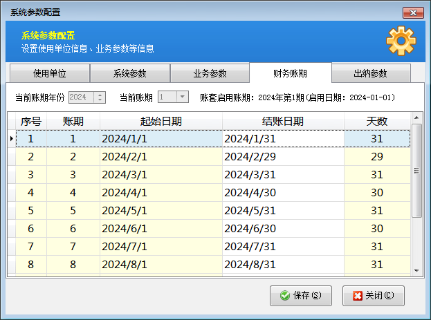 賬期設(shè)置:點(diǎn)“賬期設(shè)置”按鈕可以設(shè)置每個(gè)賬期的起始日期。每年共12個(gè)賬期,默認(rèn)是按照自然月劃分賬期。