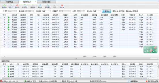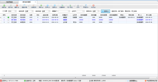 查詢:可以根據(jù)年度、目標(biāo)性質(zhì)、目標(biāo)類型、部門、業(yè)務(wù)員及審核狀態(tài)等條件查詢績效目標(biāo)記錄。