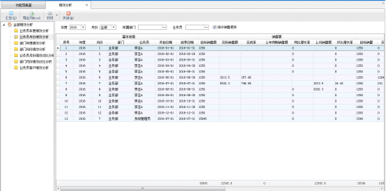 ????在功能導(dǎo)航窗點擊“擴展應(yīng)用”——“績效分析”,即可進入到績效分析界面,包含業(yè)務(wù)員年度績效分析、業(yè)務(wù)員月份績效分析、部門年度績效分析、部門月份績效分析、業(yè)務(wù)員月份績效對比分析、部門月份績效對比分析、業(yè)務(wù)員客戶績效分析等,其界面如下圖所示。