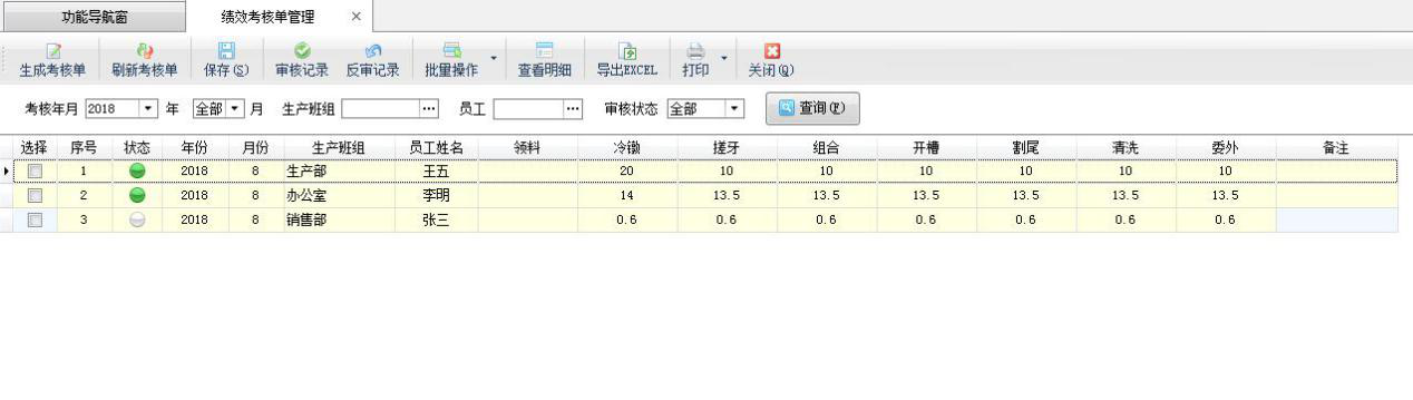 查詢:可以根據(jù)考核日期、生產(chǎn)班組、員工、審核狀態(tài)等條件查詢考核單記錄。