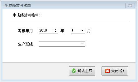 生成績效考核單:點擊“生成考核單”按鈕,可以彈出生成績效考核單窗口,在此窗口可以選擇年度、月份及相應(yīng)的生產(chǎn)班組,然后點擊“確認(rèn)生成”按鈕即可生成相應(yīng)的績效考核單,如圖所示: