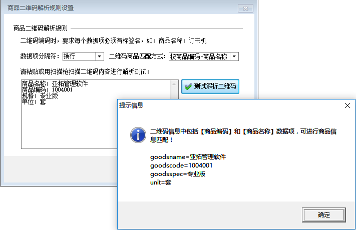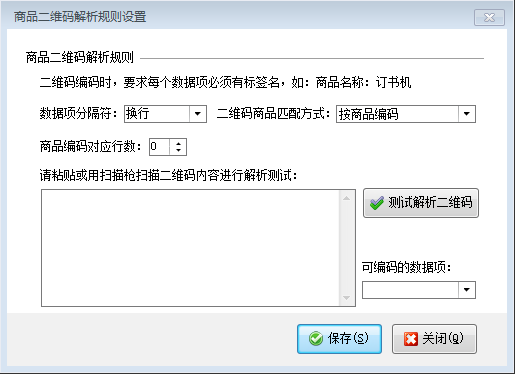 ????在功能導航窗點擊“擴展應用”—》“商品二維碼規則”可以設置商品二維碼解析規則,其界面如下圖所示。