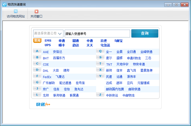 ????在功能導航窗點“擴展應用”—》“快遞查詢”即可進入“物流快遞查詢”界面,如下圖所示: