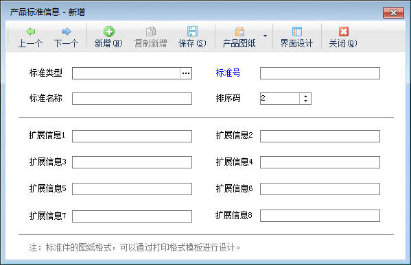 打印:在工具欄點“打印”—》“打印”可以快速打印產品標準列表;點“打印格式設計”可以打開“打印格式設置”窗口,可以新增、修改、刪除打印格式模板。