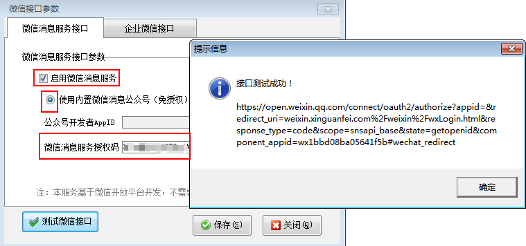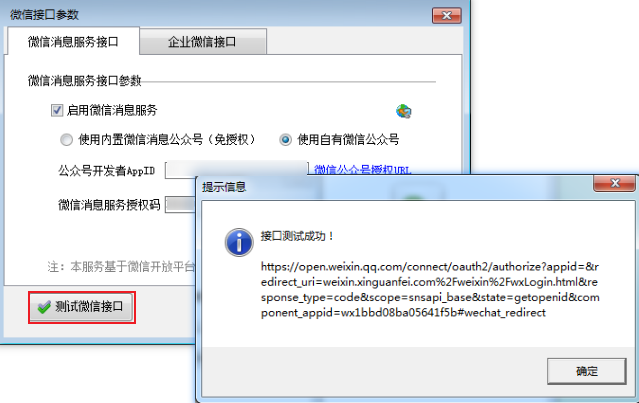 ????授權成功后,我們會分配微信云服務使用的期限和服務密碼。把服務密碼復制到微信接口參數中。點擊測試接口,提示“接口測試成功”則可以開業務單據推送微信消息。如下圖所示: