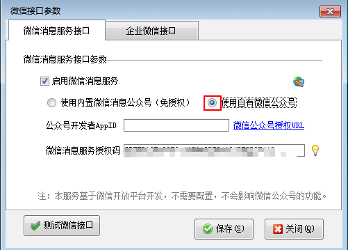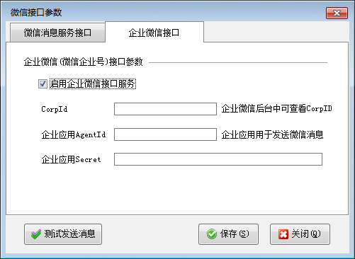????在功能導航窗點擊“擴展應用”—》“微信接口參數”可以打開微信接口參數設置窗口,可以設置微信消息服務接口參數以及企業微信接口參數。