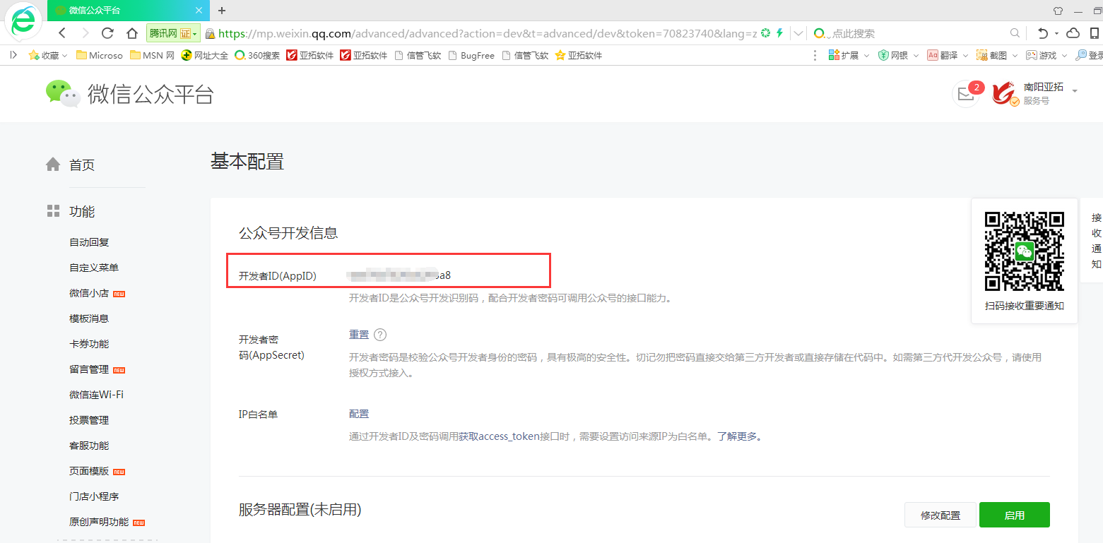 ????公眾號開發者 AppID:登錄企業微信公眾號,在微信公眾平臺的首頁導航欄下拉到最后,選擇開發模塊的“基本配置”。在基本配置中復制下“開發者 ID(AppID)”信息。如下圖所示: