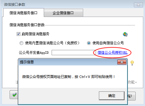 授權微信云服務:把公眾號開發者 ID 信息復制到參數配置界面的公眾號開發者 AppID 中,點擊“復制微信公眾號授權頁面 URL”,提示“授權頁面地址已復制,按 Ctrl+V 即可復制粘貼使用”。如下圖所示: