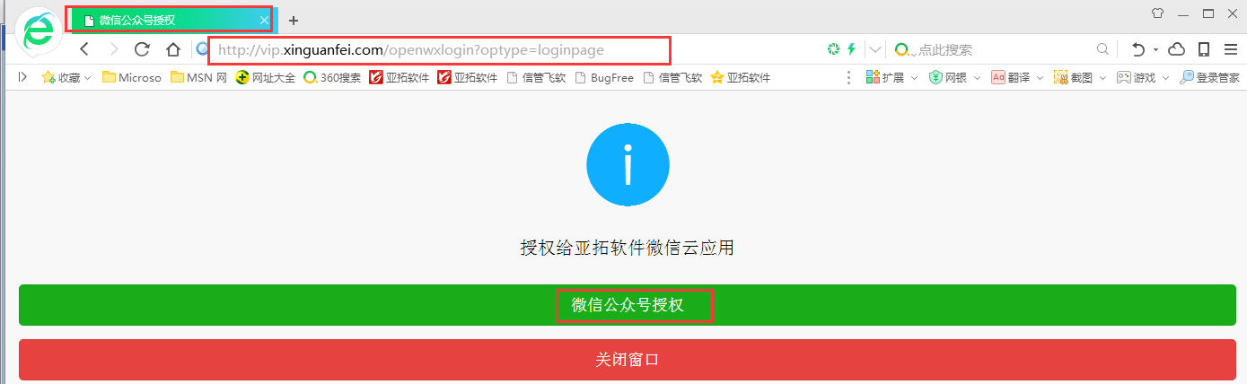 ????打開瀏覽器,在瀏覽器地址欄中按 Ctrl+V,把微信公眾號授權頁面地址復制進去,點擊確認鍵進入授權頁面,如下圖所示: