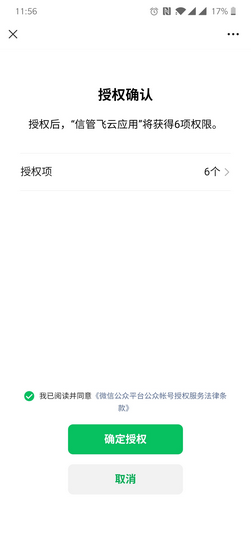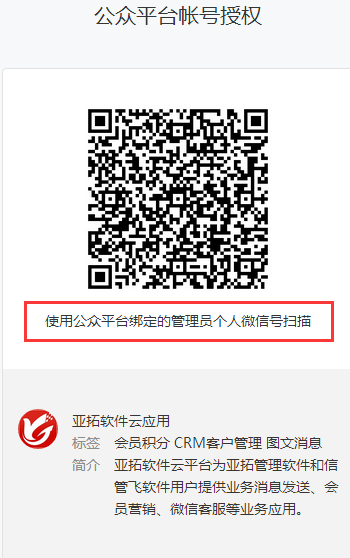 ????點擊“微信公眾號授權”會彈出公眾平臺賬號授權二維碼。使用公眾平臺綁定的管理員個人微信號進行掃描。會在手機微信上彈出一個授權確認界面,把微信公眾號授權給亞拓軟件云應用。如下圖所示: