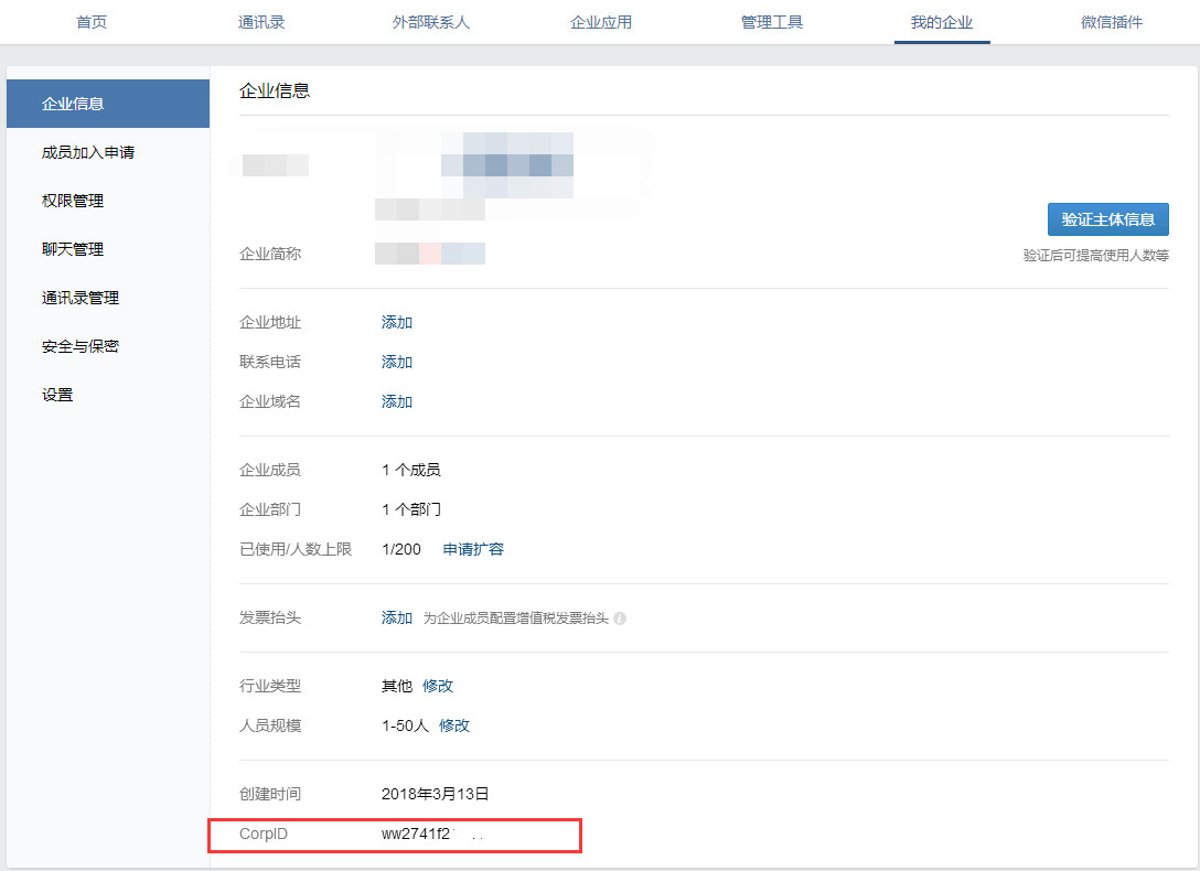 CorpId:登錄企業微信,然后點擊“我的企業”—》“企業信息”,在企業信息內可以查看“CorpId”,如下圖所示。