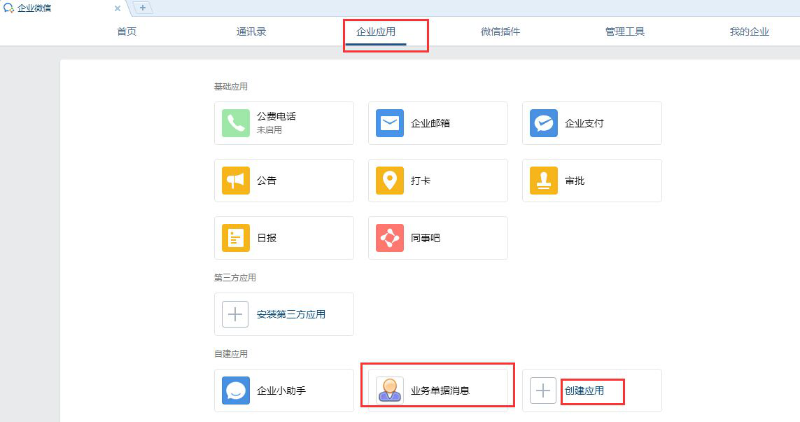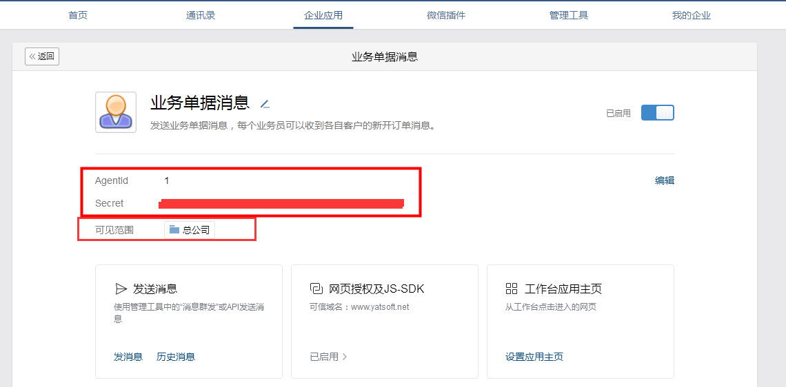 ????在企業微信“我的應用”內增加應用“業務單據消息”并設置應用可見范圍,應用創建成功后,在應用詳情界面可以查看企業應用 Agentld 以及企業應用 Secret,如下圖所示。