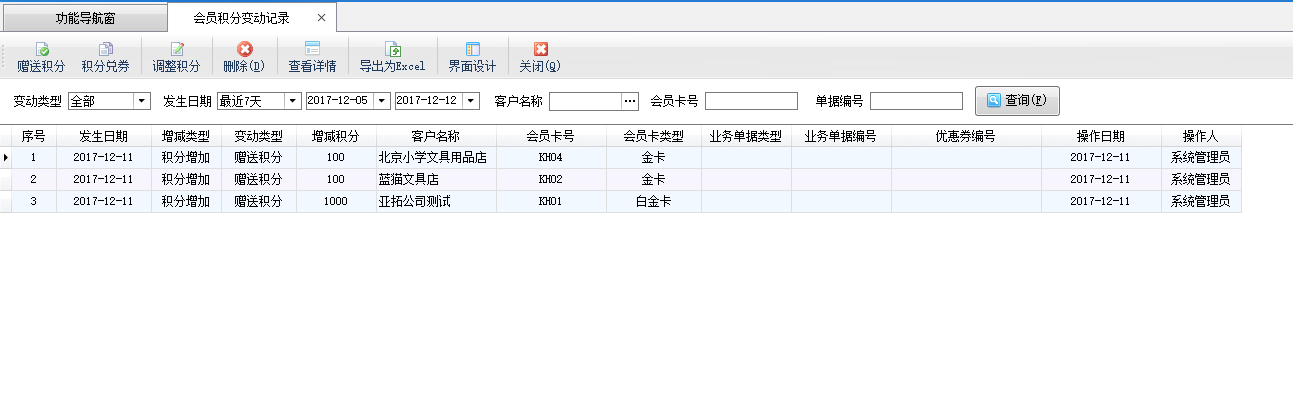 ????會員積分管理功能可以對積分卡的會員積分變動情況進行管理,在功能導航窗點擊“會員管理”—》“會員積分管理”可以打開會員積分變動記錄界面,其界面如下圖所示。