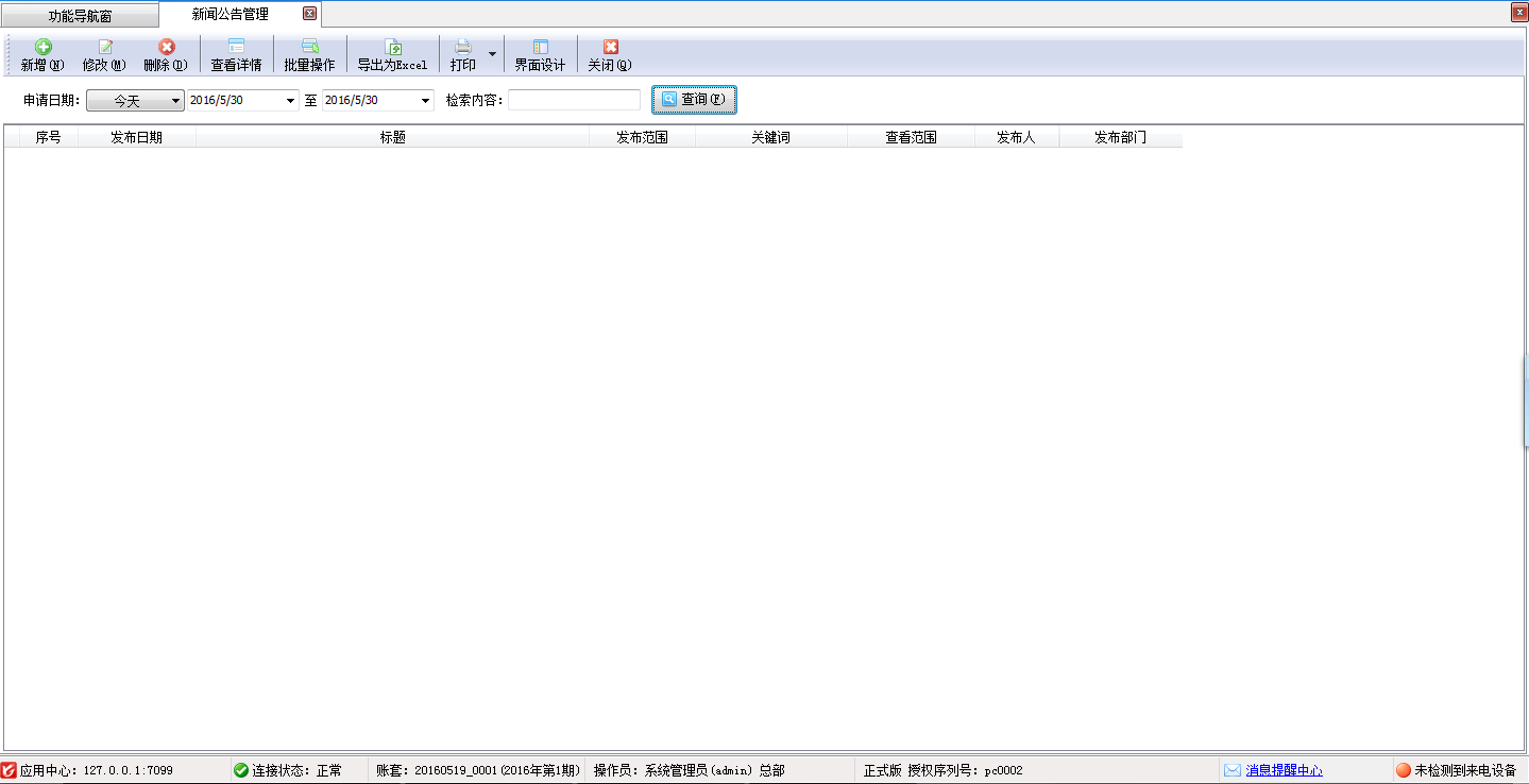 ????在功能導航窗點擊“擴展應用”—》“新聞公告管理”即可進入“新聞公告管理”界面,如下圖所示: