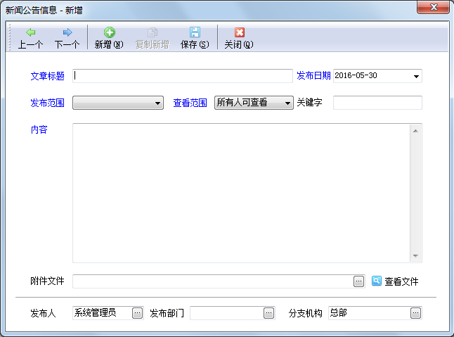 ????新增新聞公告:點擊工具欄的“新增”按鈕即可新增新聞公告,可以選擇“發布范圍”及“查看范圍”,發布在“內部”時,有查看權限的操作員登錄系統后即可查看到已發布的新聞公告,發布在“客戶服務平臺”時,客戶賬號在“訂貨管家”系統內可以查看到已發布的新聞公告。