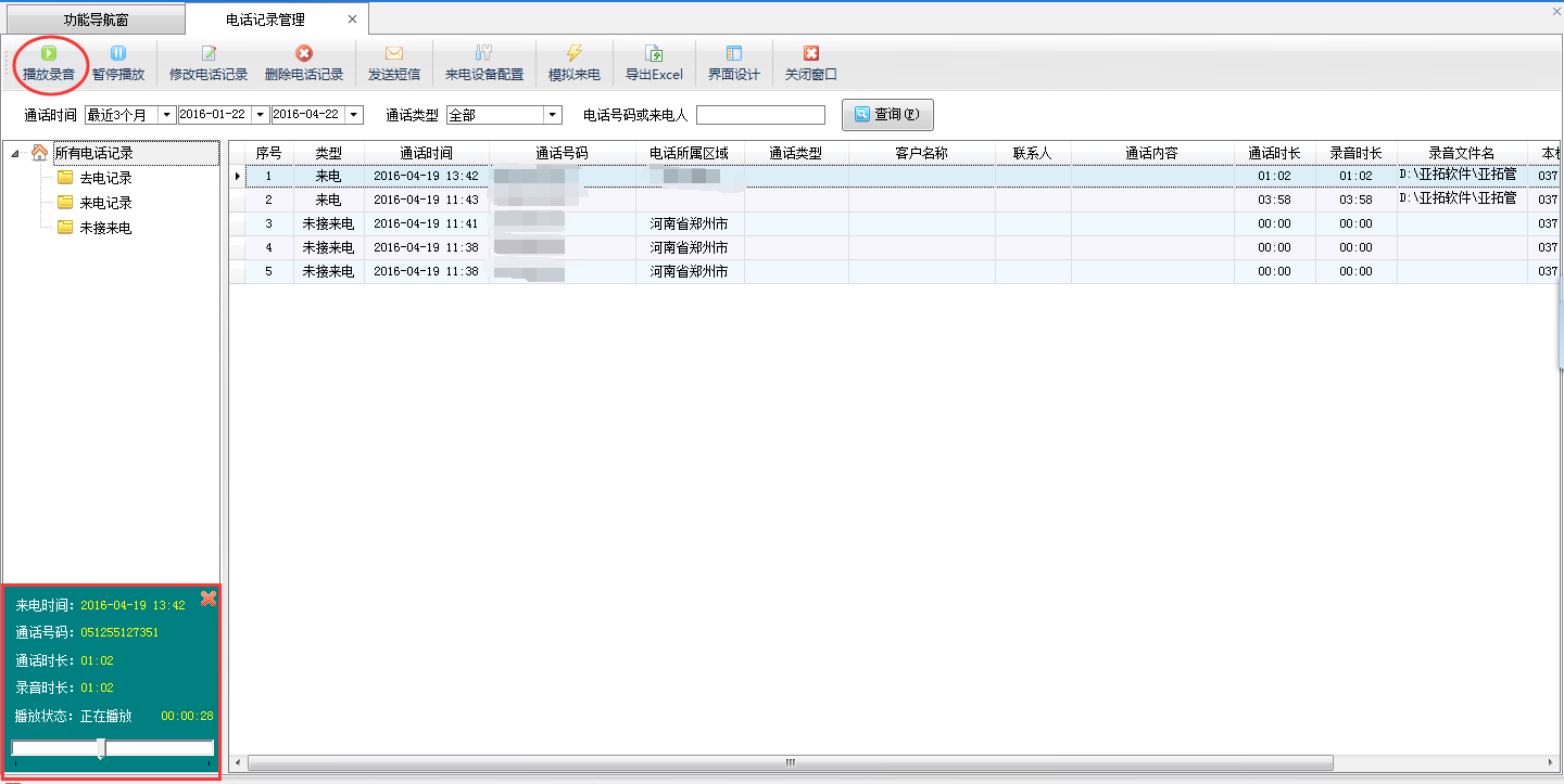 ????在電話記錄管理界面選擇通話時間,輸入來電號碼或者來電人信息查詢即可查詢到我們所需要的來電信息,選擇所需要的來電信息,點擊“播放錄音”按鈕即可播放當前來電的通話自動錄音,點“暫停播放”即可暫停正在播放的錄音文件。
