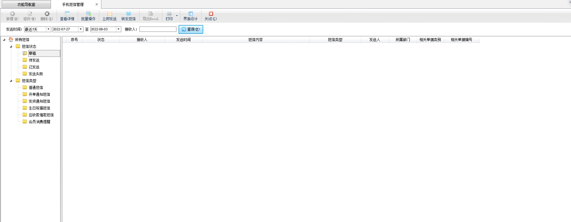 新增短信:在工具欄點擊“新增”按鈕即可打開“發送手機短信”窗口,可以新增短信并直接發送,或者是將短信保存為草稿狀態。