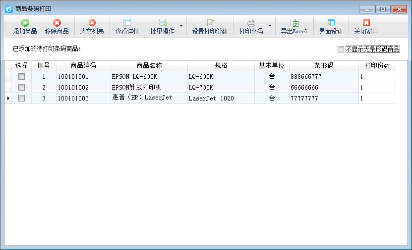 移除商品:在工具欄點擊“移除商品”按鈕,可以移除已添加到待打印商品列表內的無需打印條形碼的商品。