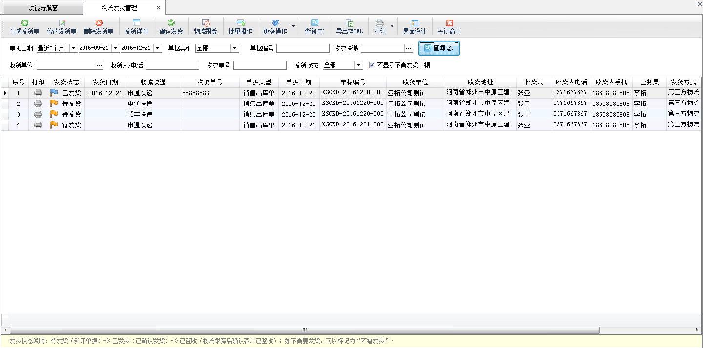 查詢:可以根據單據日期、單據類型、單據編號、物流快遞、收貨單位、收貨人、電話、物流單號、發貨狀態等條件查詢發貨單。