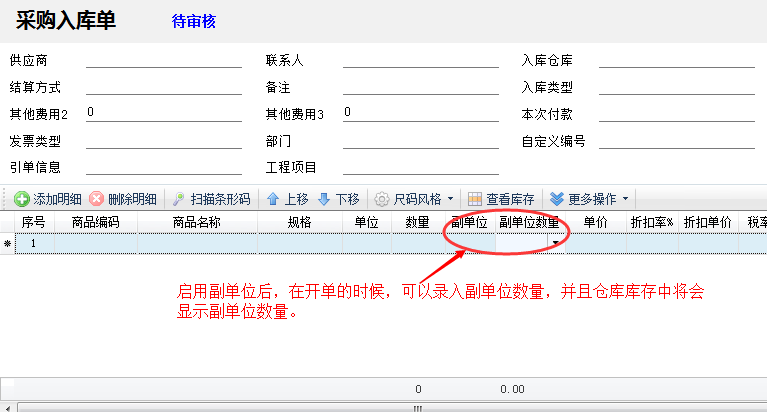 ????啟用商品副單位后,在商品信息中可以維護(hù)副單位,在業(yè)務(wù)單據(jù)明細(xì)中可以輸入副單位的數(shù)量。保存審核單據(jù)后,軟件會(huì)自動(dòng)計(jì)算倉庫中的副單位數(shù)量。
