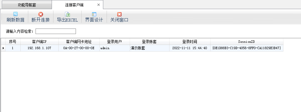 ????在連接客戶端管理內(nèi)可以管理已連接到主機(jī)的客戶端電腦信息,包括客戶端 IP、客戶端網(wǎng)卡地址、登錄操作員、登錄賬套以及登錄時(shí)間。