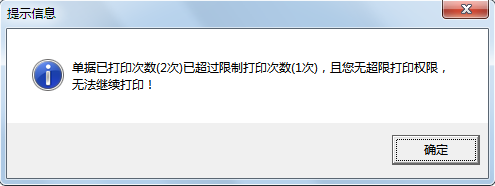 ????通過設(shè)置這個(gè)參數(shù),可以避免開單人員開單打印后又修改單據(jù),出現(xiàn)軟件中的單據(jù)內(nèi)容與打印出來的單據(jù)不一樣的情況。設(shè)置報(bào)表打印超過打印次數(shù)限制后,在業(yè)務(wù)單據(jù)打印中(基礎(chǔ)資料、統(tǒng)計(jì)查詢功能中沒有限制)如果單據(jù)打印的次數(shù)超過限制數(shù)量,則軟件會(huì)提示如下信息: