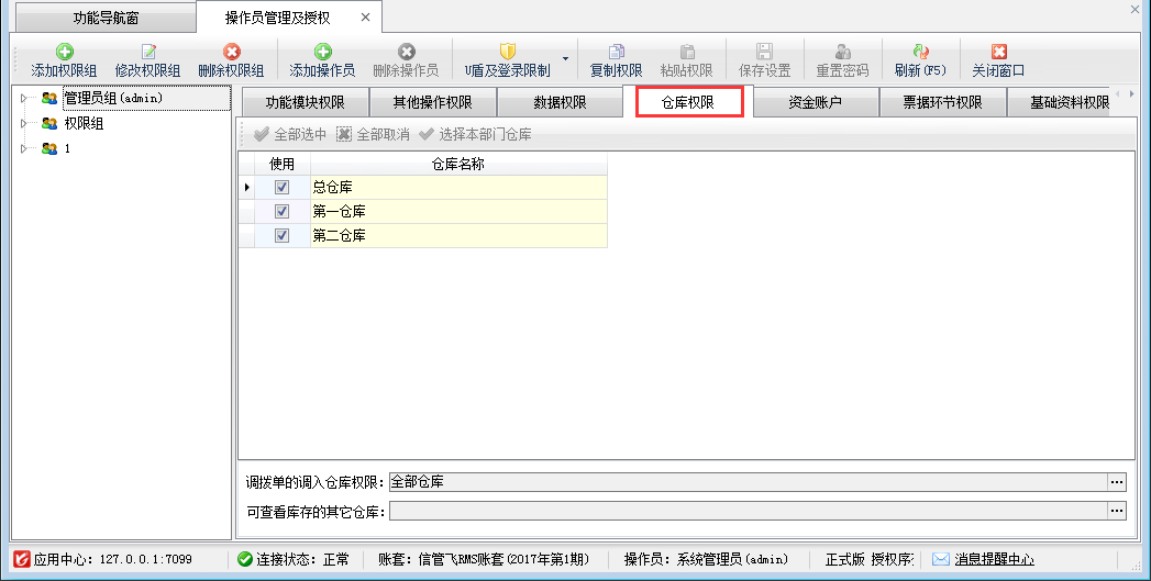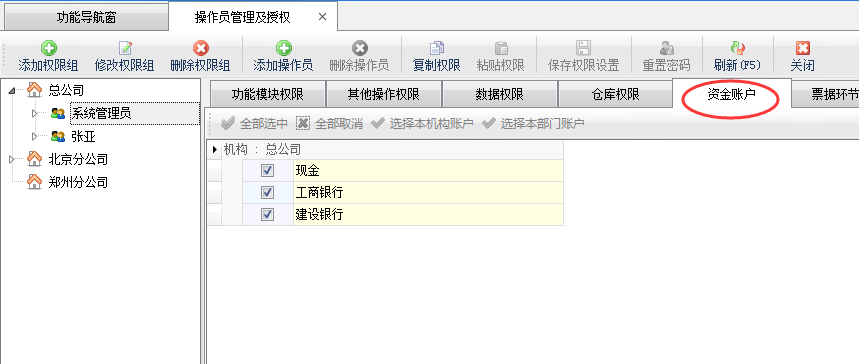 ????⑤ 倉庫權(quán)限、資金賬戶權(quán)限屬于特殊的數(shù)據(jù)權(quán)限,可根據(jù)情況給每個(gè)操作員設(shè)置可管理的倉庫和資金賬戶。