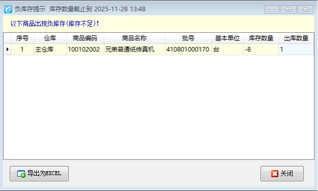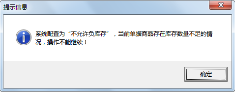 ????啟用“負(fù)庫存提示”時(shí),如果單據(jù)明細(xì)中的商品出現(xiàn)負(fù)庫存,則軟件彈出如下提示窗口。如果不允許負(fù)庫存出庫,則軟件彈出審核失敗,庫存數(shù)量不足!