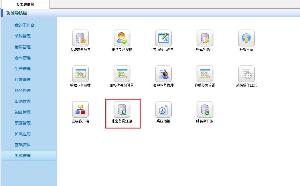 ????在功能導(dǎo)航窗中點(diǎn)擊“系統(tǒng)管理”—》“賬套備份”同樣可以執(zhí)行賬套備份操作,如下圖所示。