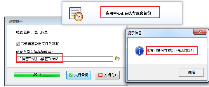 ????② 如果需要將賬套備份文件同時(shí)存儲(chǔ)在客戶端電腦上時(shí),需要打勾選中“下載賬套文件到本地”,然后選擇賬套備份文件需要存儲(chǔ)的文件路徑,點(diǎn)擊“執(zhí)行備份”按鈕即可將賬套備份在客戶端所在的電腦上存儲(chǔ)。