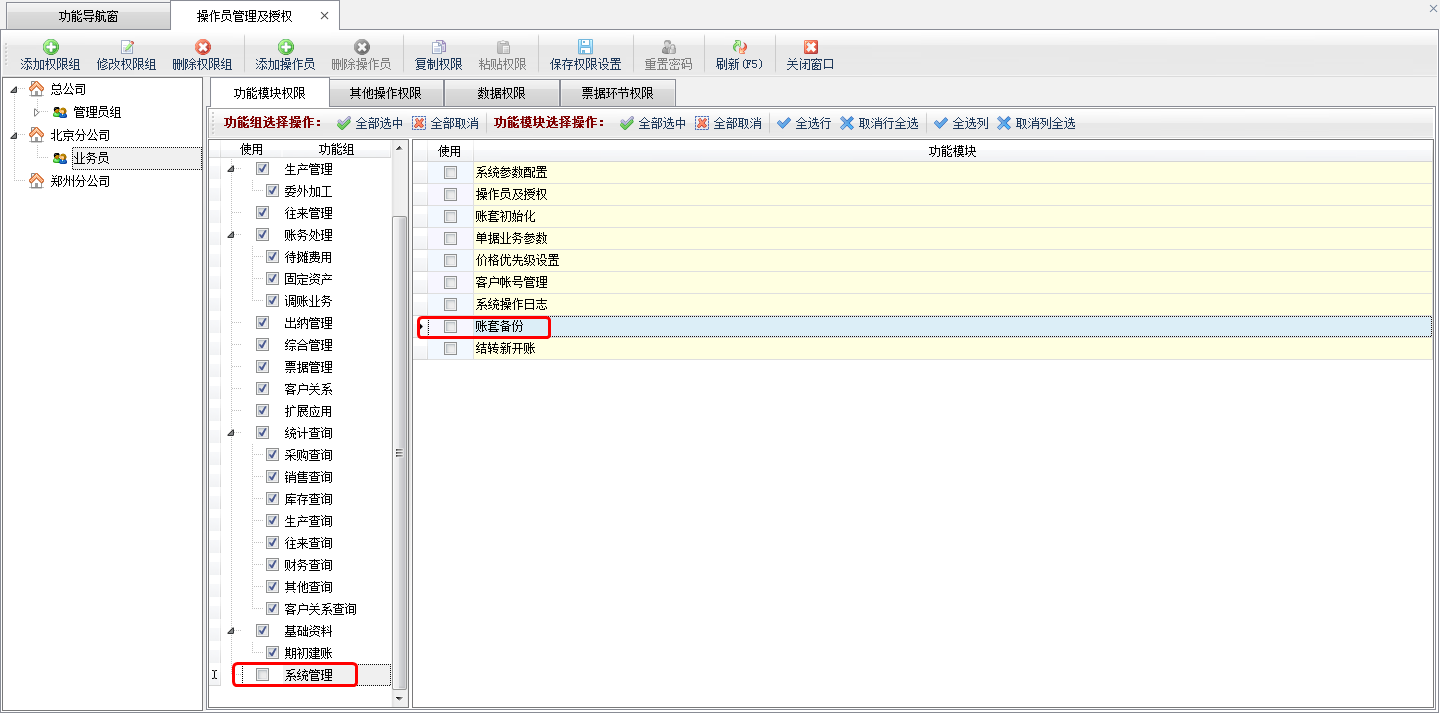 ????③ 如果操作員有“賬套備份”的相應(yīng)權(quán)限,那么可以在客戶端中進(jìn)行備份賬套操作,如果操作員沒有“賬套備份”的相應(yīng)權(quán)限,則不能在客戶端中對(duì)賬套進(jìn)行備份操作(操作員權(quán)限可以在功能導(dǎo)航窗點(diǎn)擊“系統(tǒng)管理”——“操作員及授權(quán)”中設(shè)置),如下圖所示。
