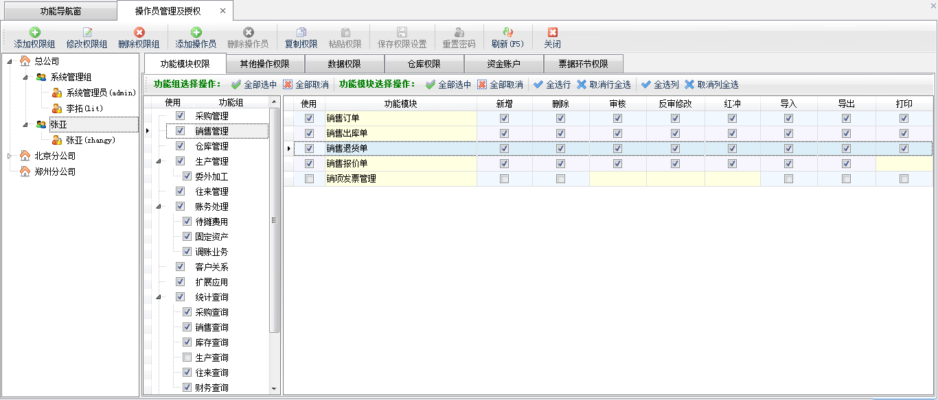 ????① 設(shè)置功能模塊權(quán)限的時(shí)候,注意打勾選擇“使用”后,還需要設(shè)置詳細(xì)的操作權(quán)限(如新增、刪除、審核、反審修改、紅沖、導(dǎo)入、導(dǎo)出、打印等),如果不設(shè)置詳細(xì)的模塊操作權(quán)限,則只能進(jìn)入功能模塊,但無法執(zhí)行任何操作。
