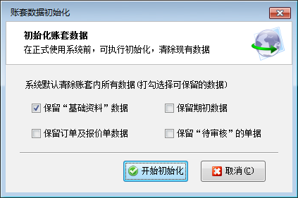 ????默認(rèn)初始化會(huì)刪除所有的數(shù)據(jù)(包括基礎(chǔ)資料和業(yè)務(wù)單據(jù)),可打勾選擇要保留的數(shù)據(jù)內(nèi)容。點(diǎn)“開始初始化”等待軟件執(zhí)行完成即可。