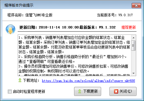 ????在功能導(dǎo)航窗點(diǎn)擊“系統(tǒng)管理”—》“升級(jí)更新”即可檢查程序更新,如有新版本,會(huì)彈出“程序版本升級(jí)提示”,點(diǎn)擊“下載更新”按鈕即可更新最新版本,其界面如下圖所示。