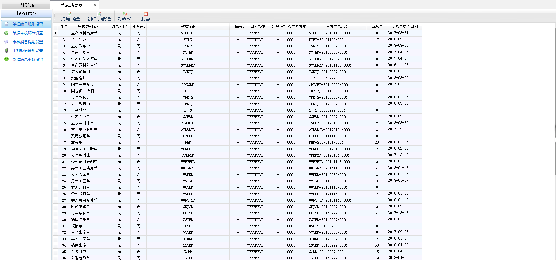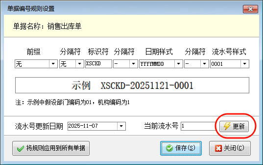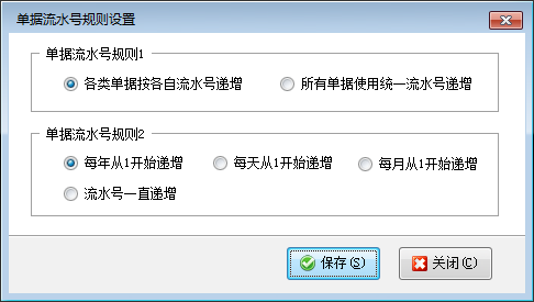 流水號(hào)規(guī)則設(shè)置:點(diǎn)工具欄中的“流水號(hào)規(guī)則設(shè)置”,可以配置單據(jù)流水號(hào)的生成規(guī)則。配置各類單據(jù)按各自流水號(hào)遞增,還是所有單據(jù)采用統(tǒng)一流水號(hào)遞增;流水號(hào)每年、每月、每天從 1 遞增,還是一直遞增。