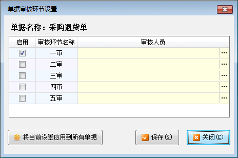 單據(jù)審核環(huán)節(jié)設(shè)置:可以設(shè)置每類單據(jù)的審核環(huán)節(jié),最多支持 5 級(jí)審核。在界面左側(cè)點(diǎn)擊“單據(jù)環(huán)節(jié)設(shè)置”,右側(cè)顯示所有業(yè)務(wù)單據(jù)的環(huán)節(jié)信息。然后點(diǎn)工具欄中的“單據(jù)環(huán)節(jié)設(shè)置”按鈕,可以配置當(dāng)前單據(jù)的審核環(huán)節(jié)(審核環(huán)節(jié)名稱、該環(huán)節(jié)可進(jìn)行審核的人員)。點(diǎn)上圖中的“將當(dāng)前設(shè)置應(yīng)用到所有單據(jù)”可以快速將環(huán)節(jié)配置復(fù)制到所有單據(jù)。
