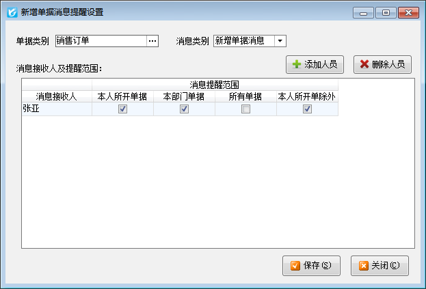 消息接收人以及提醒范圍:可以設(shè)置選擇的單據(jù)類別下的哪些單據(jù)需要提醒,以及提醒的具體接收人。