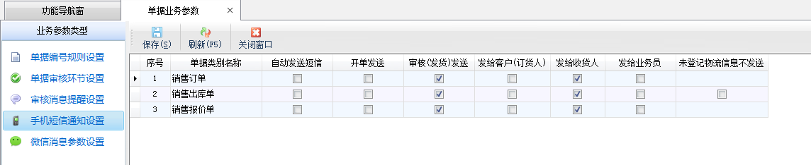 手機(jī)短信通知設(shè)置:可以設(shè)置手機(jī)短信發(fā)送人員(業(yè)務(wù)員、收貨人、訂貨人)、發(fā)送時(shí)間以及是否自動(dòng)發(fā)送等。
