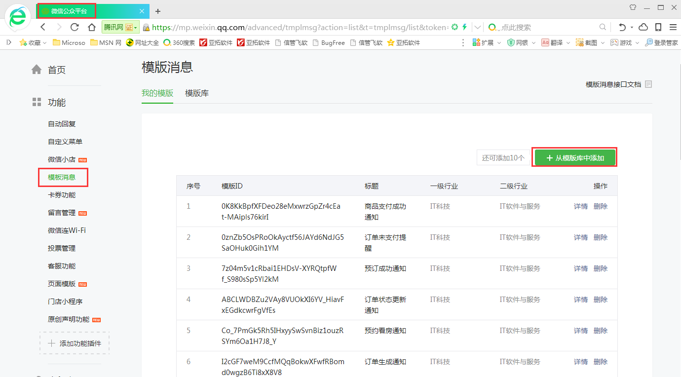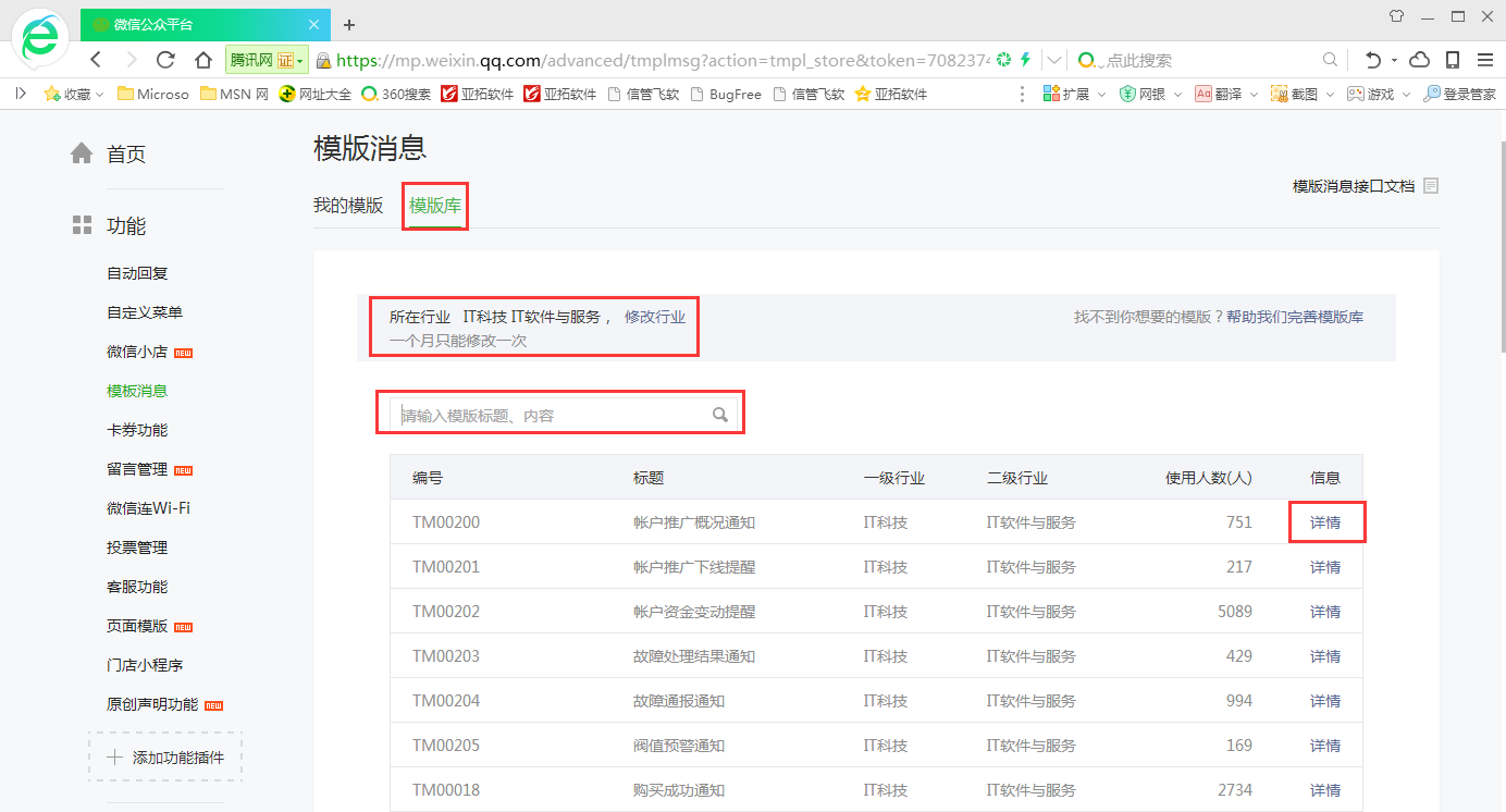????在模板庫中點(diǎn)擊“詳情”,在詳情介紹下進(jìn)行添加微信消息模板。