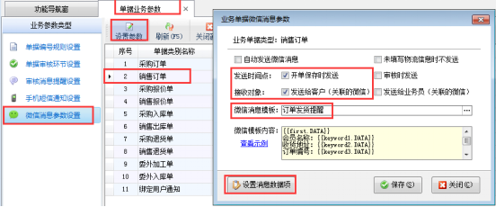 微信消息參數(shù)設(shè)置:可以設(shè)置微信消息是否自動(dòng)發(fā)送,發(fā)送時(shí)間、發(fā)送人員以及對(duì)不同單據(jù)設(shè)置相應(yīng)的微信消息模板。