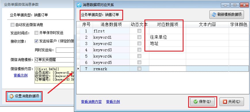????微信消息模板選擇“訂單發(fā)貨提醒”,點(diǎn)擊“設(shè)置消息數(shù)據(jù)項(xiàng)”可以對(duì)應(yīng)數(shù)據(jù)項(xiàng)。如下圖所示: