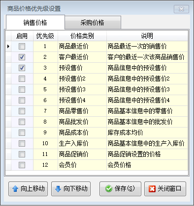 ????打勾啟用表示生效,點(diǎn)“向上移動(dòng)”和“向下移動(dòng)”可以調(diào)整價(jià)格的優(yōu)先順序,按上一個(gè)價(jià)格策略沒有獲取到價(jià)格,則自動(dòng)按下一個(gè)價(jià)格策略獲取價(jià)格。