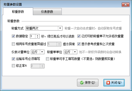 ????稱重參數(shù)設(shè)置可以設(shè)置稱重參數(shù)及儀表參數(shù),其中儀表參數(shù)請(qǐng)根據(jù)所連接稱重設(shè)備進(jìn)行設(shè)置,稱重方式支持“稱重兩次”、“稱重一次自動(dòng)去皮重”、“稱重一次不要皮重”三種方式,并可以設(shè)置已打印的稱重單是否允許修改重量、運(yùn)輸車號(hào)是否必須填寫等,用戶可根據(jù)自身業(yè)務(wù)特點(diǎn)進(jìn)行設(shè)置。
