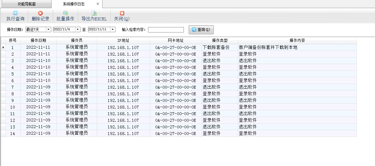 ????在功能導(dǎo)航窗點(diǎn)“系統(tǒng)管理”—》“系統(tǒng)操作日志”即可進(jìn)入“操作日志”界面,如下圖所示: