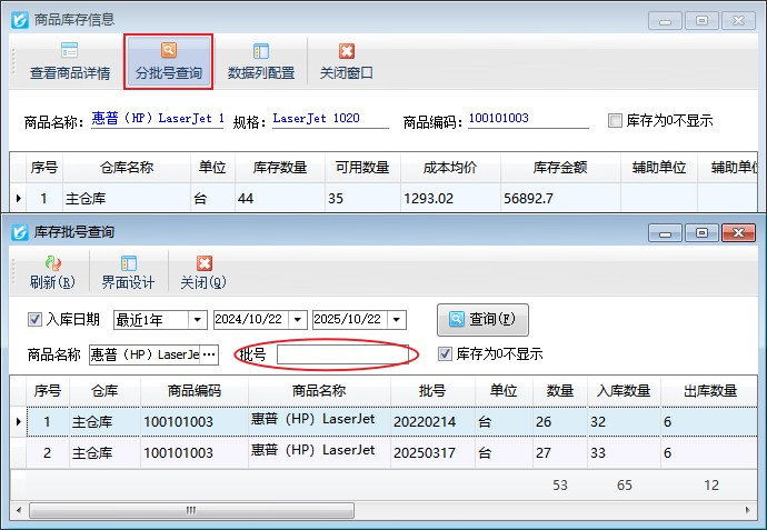 (6)查看庫存:點擊“查看庫存”按鈕,可查看當前商品不同倉庫的庫存信息;若商品存在不同批號可以分批號查詢商品庫存信息。