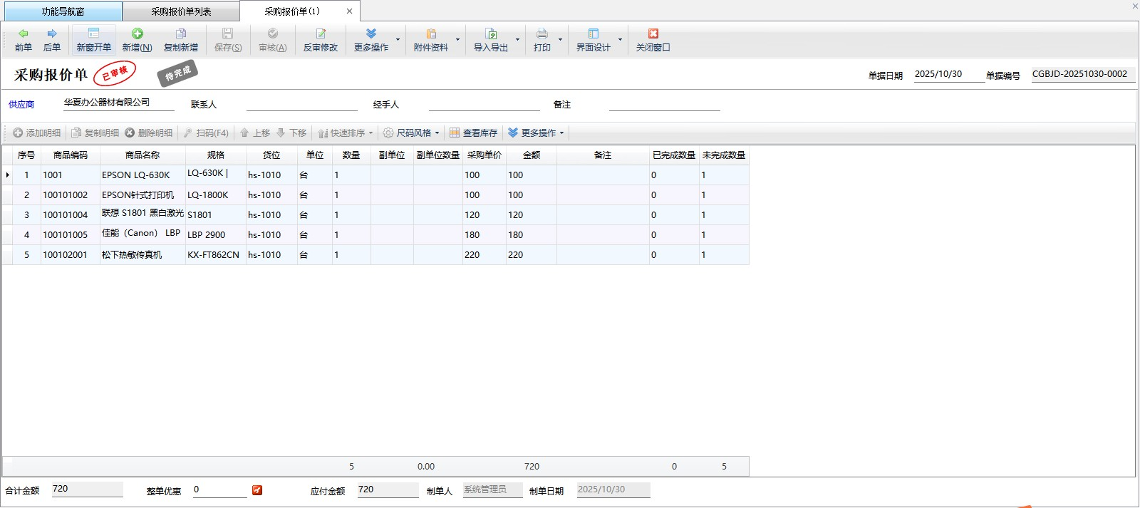 ????在功能導航窗點“采購管理”—》“采購報價單”即可進入“采購報價單列表”界面,如下圖所示: