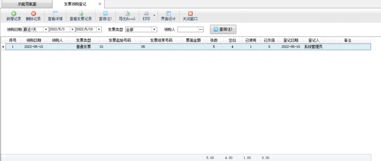 ????發票領購登記:點擊“發票登記領購”按鈕,進入“發票領購登記”界面,其界面如下圖所示,可以登記空白發票信息、查看發票記錄。