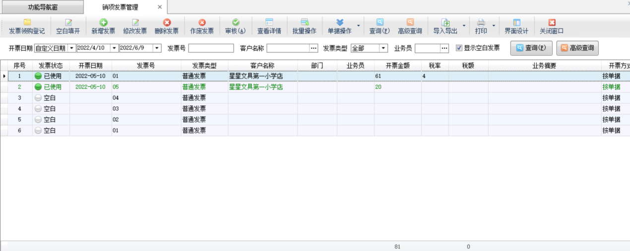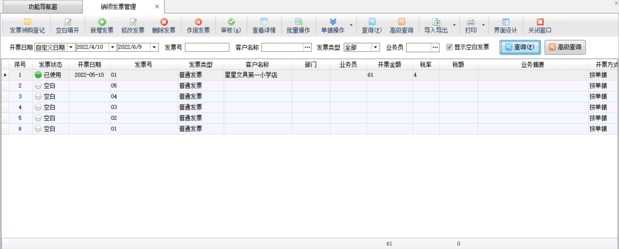查詢:可以根據開票日期、發票號、客戶名稱、發票類型、業務員等信息查詢銷項發票。